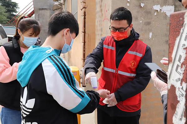 ▲中國中鐵陸港核心區(qū)“防疫先鋒”志愿者服務(wù)隊隊員為居民測量體溫